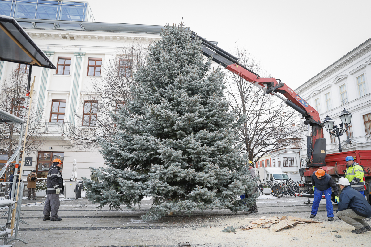 Hétfőn a Győr-Szol Zrt. munkatársai felállították a Széchenyi téren azt a körülbelül 8 méter magas ezüstfenyőt, amely a város karácsonyfája lesz idén. A különösen szép fenyőfa a hagyományoknak megfelelően lakossági felajánlásból származik.