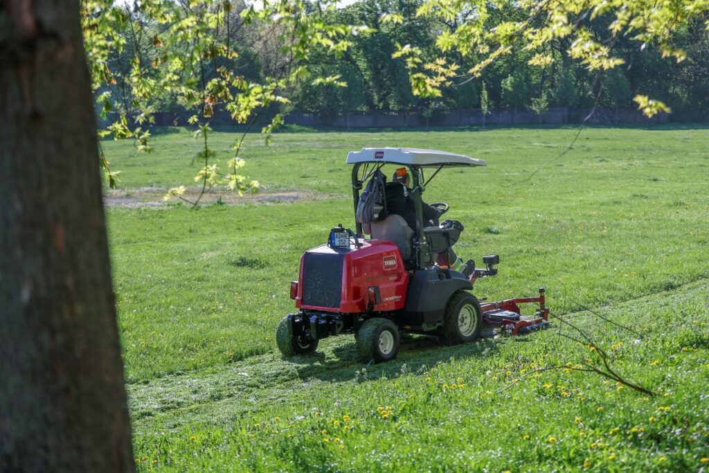 Az idei év újdonsága, a hogy a munka során a fák körül mintegy 20-25 centiméter szélességben sem géppel sem kézi kaszával nem nyírják le a füvet, ezzel is óvva a növények törzsét a sérülésektől.