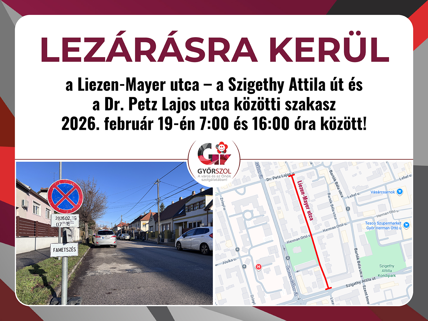 A Győr-Szol Zrt. tájékoztatja a lakosságot, hogy 2026. február 19-én (csütörtök) 7:00 és 16:00 óra között faápolási munkák miatt útlezárásra és parkolási tilalomra kerül sor a Liezen-Mayer utca – a Szigethy Attila út és a Dr. Petz Lajos utca közötti szakaszon. A munkálatok során – a közlekedésbiztonság és a fák hosszú távú megőrzése érdekében – mintegy 60 darab fa szakszerű metszését végzi el a szolgáltató.